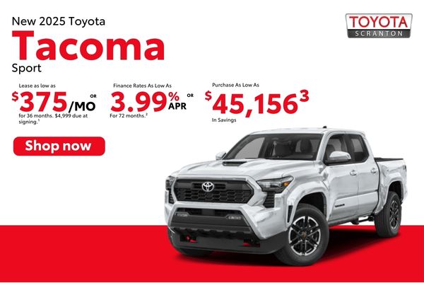2025 Toyota Tacoma Sport, Example VIN: 3TMLB5JN8SM201871, Model #: 7542, TSRP: $47,997. ¹Lease for $375 per month for 36 months with $4,999 due at signing plus tax, title, license and registration fees, any emission testing charges, $477 dealer documentation fee, and $650 and lease acquisition fee. Closed end lease. No security deposit required. 10,000 miles per year. Total cost of payments: $30,000. Must qualify for all rebates and programs. Not all lessees will qualify. Option to purchase for $34,078 at lease end. Lessee is responsible for insurance, maintenance, repairs, excess wear, $350 disposition fee, and mileage charges of $0.15 per mile over 30,000 total miles. Lease available to well qualified buyers through Toyota Financial Services and is subject to credit approval. ²3.99% APR financing for 72 months. $15.64 per month per $1,000 financed at 72 months. APR financing available to well qualified buyers through Toyota Financial Services and is subject to credit approval. Not available on balloon financing. Not all will qualify.³Purchase for as low as $45,156 plus tax, title, license and registration fees, any emission testing charges, and $477 dealer documentation fee. Must qualify for all rebates and programs. Not all will qualify. *Image for illustration purposes. Individual offers cannot be combined. Cannot be combined with other offers not listed. Offers end on 02/02/2026. Manufacturer reserves the right to change their incentives at any time without notice. See dealer for complete details.