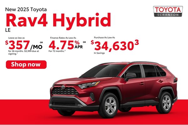 2025 Toyota Rav4 Hybrid LE, Example VIN: JTMMWRFV9SD349371, Model #: 4435, TSRP: $36,262. ¹Lease for $357 per month for 36 months with $3,999 due at signing plus tax, title, license and registration fees, any emission testing charges, $477 dealer documentation fee, and $650 and lease acquisition fee. Closed end lease. No security deposit required. 10,000 miles per year. Total cost of payments: $30,000. Must qualify for all rebates and programs. Not all lessees will qualify. Option to purchase for $24,658 at lease end. Lessee is responsible for insurance, maintenance, repairs, excess wear, $350 disposition fee, and mileage charges of $0.15 per mile over 30,000 total miles. Lease available to well qualified buyers through Toyota Financial Services and is subject to credit approval. ²4.75% APR financing for 72 months. $15.99 per month per $1,000 financed at 72 months. APR financing available to well qualified buyers through Toyota Financial Services and is subject to credit approval. Not available on balloon financing. Not all will qualify.³Purchase for as low as $34,630 plus tax, title, license and registration fees, any emission testing charges, and $477 dealer documentation fee. Must qualify for all rebates and programs. Not all will qualify. *Image for illustration purposes. Individual offers cannot be combined. Cannot be combined with other offers not listed. Offers end on 02/02/2026. Manufacturer reserves the right to change their incentives at any time without notice. See dealer for complete details.