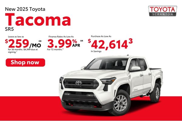 2025 Toyota Tacoma SR5, Example VIN: 3TMLB5JN2SM187918, Model #: 7540, TSRP: $45,202. ¹Lease for $259 per month for 36 months with $4,999 due at signing plus tax, title, license and registration fees, any emission testing charges, $477 dealer documentation fee, and $650 and lease acquisition fee. Closed end lease. No security deposit required. 10,000 miles per year. Total cost of payments: $30,000. Must qualify for all rebates and programs. Not all lessees will qualify. Option to purchase for $33,449 at lease end. Lessee is responsible for insurance, maintenance, repairs, excess wear, $350 disposition fee, and mileage charges of $0.15 per mile over 30,000 total miles. Lease available to well qualified buyers through Toyota Financial Services and is subject to credit approval. ²3.99% APR financing for 72 months. $15.64 per month per $1,000 financed at 72 months. APR financing available to well qualified buyers through Toyota Financial Services and is subject to credit approval. Not available on balloon financing. Not all will qualify.³Purchase for as low as $42,614 plus tax, title, license and registration fees, any emission testing charges, and $477 dealer documentation fee. Price includes $1,000 TFS Subvention Cash. Must qualify for all rebates and programs. Not all will qualify. *Image for illustration purposes. Individual offers cannot be combined. Cannot be combined with other offers not listed. Offers end on 02/02/2026. Manufacturer reserves the right to change their incentives at any time without notice. See dealer for complete details.