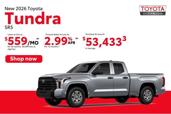 2026 Toyota Tundra SR5, Example VIN: 5TFLA5DB0TX373523, Model #: 8361, TSRP: $56,961. ¹Lease for $559 per month for 36 months with $4,999 due at signing plus tax, title, license and registration fees, any emission testing charges, $477 dealer documentation fee, and $650 and lease acquisition fee. Closed end lease. No security deposit required. 10,000 miles per year. Total cost of payments: $30,000. Must qualify for all rebates and programs. Not all lessees will qualify. Option to purchase for $37,594 at lease end. Lessee is responsible for insurance, maintenance, repairs, excess wear, $350 disposition fee, and mileage charges of $0.15 per mile over 30,000 total miles. Lease available to well qualified buyers through Toyota Financial Services and is subject to credit approval. ²2.99% APR financing for 72 months. $15.19 per month per $1,000 financed at 72 months. APR financing available to well qualified buyers through Toyota Financial Services and is subject to credit approval. Not available on balloon financing. Not all will qualify.³Purchase for as low as $53,433 plus tax, title, license and registration fees, any emission testing charges, and $477 dealer documentation fee. Price includes $3,000 Customer Cash. Must qualify for all rebates and programs. Not all will qualify. *Image for illustration purposes. Individual offers cannot be combined. Cannot be combined with other offers not listed. Offers end on 02/02/2026. Manufacturer reserves the right to change their incentives at any time without notice. See dealer for complete details.