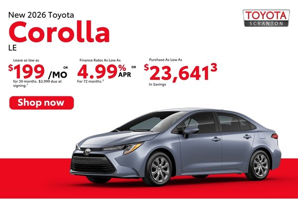 2026 Toyota Corolla LE, Example VIN: 5YFB4MDEXTP400913, Model #: 1852, TSRP: $25,172. ¹Lease for $199 per month for 39 months with $3,999 due at signing plus tax, title, license and registration fees, any emission testing charges, $477 dealer documentation fee, and $650 and lease acquisition fee. Closed end lease. No security deposit required. 10,000 miles per year. Total cost of payments: $32,500. Must qualify for all rebates and programs. Not all lessees will qualify. Option to purchase for $16,362 at lease end. Lessee is responsible for insurance, maintenance, repairs, excess wear, $350 disposition fee, and mileage charges of $0.15 per mile over 32,500 total miles. Lease available to well qualified buyers through Toyota Financial Services and is subject to credit approval. ²4.99% APR financing for 72 months. $16.10 per month per $1,000 financed at 72 months. APR financing available to well qualified buyers through Toyota Financial Services and is subject to credit approval. Not available on balloon financing. Not all will qualify.³Purchase for as low as $23,641 plus tax, title, license and registration fees, any emission testing charges, and $477 dealer documentation fee. Must qualify for all rebates and programs. Not all will qualify. *Image for illustration purposes. Individual offers cannot be combined. Cannot be combined with other offers not listed. Offers end on 02/02/2026. Manufacturer reserves the right to change their incentives at any time without notice. See dealer for complete details.